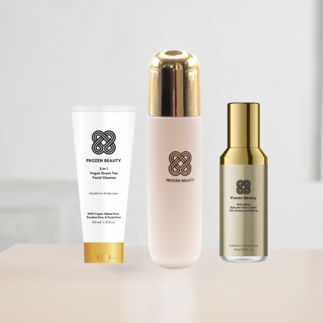 Part of the Frozen Beauty set, it supports your skincare routine. The bundle includes a cleanser, essence, and cream for eye, face, and neck. All products work together for a comprehensive skincare solution.